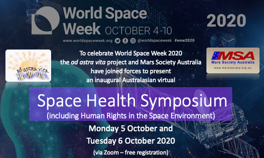 To celebrate World Space Week 2020 Mars Society Australia and the ad astra vita project have joined forces to present an inaugural Australasian virtual Space Health Symposium (including Human Rights in the Space Environment) to be held on Monday 5 October and Tuesday 6 October 2020 via Zoom (free registration).