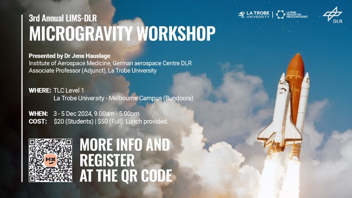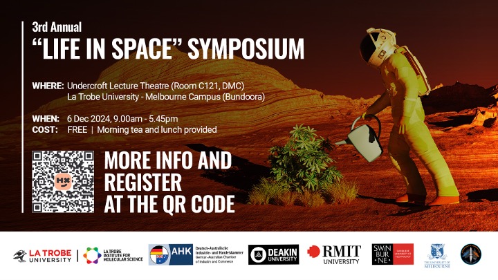 - Any questions? Email the organisers – for the Microgravity Workshop and “Life in Space” Symposium, contact LIMS.Research@latrobe.edu.au, and for Austronaut, contact thomas@austronaut.com.au.