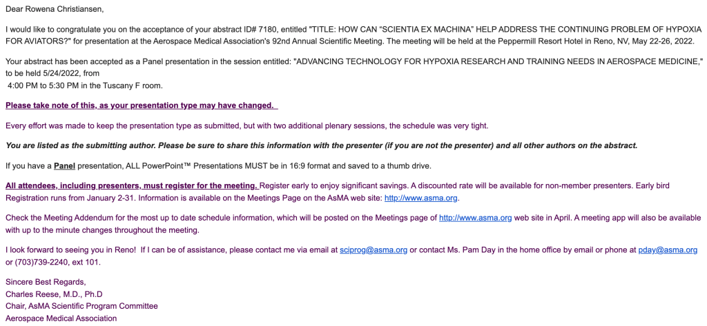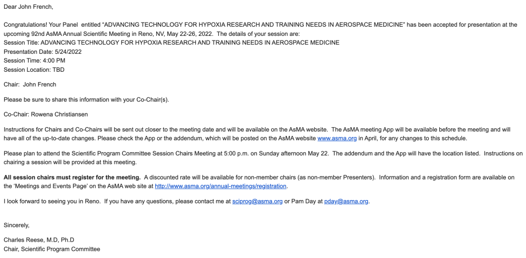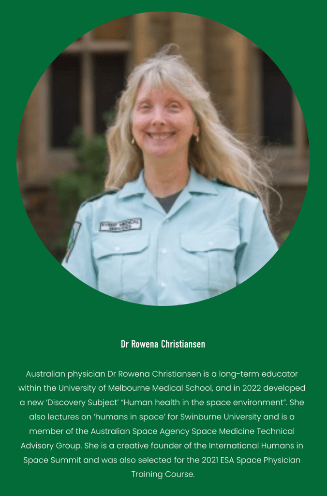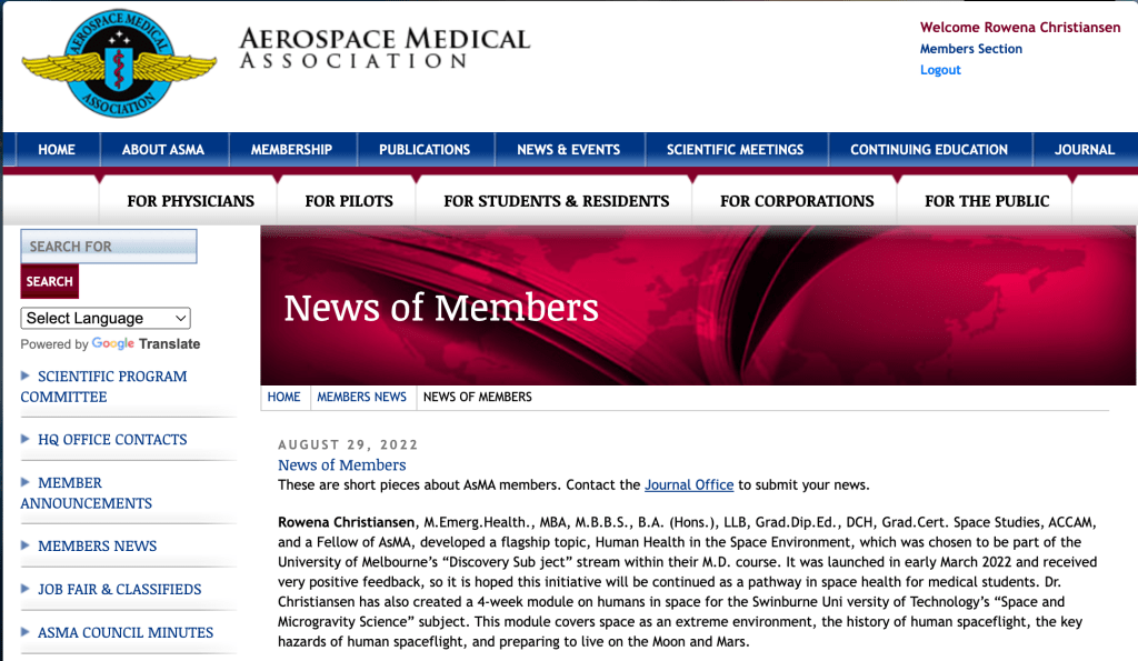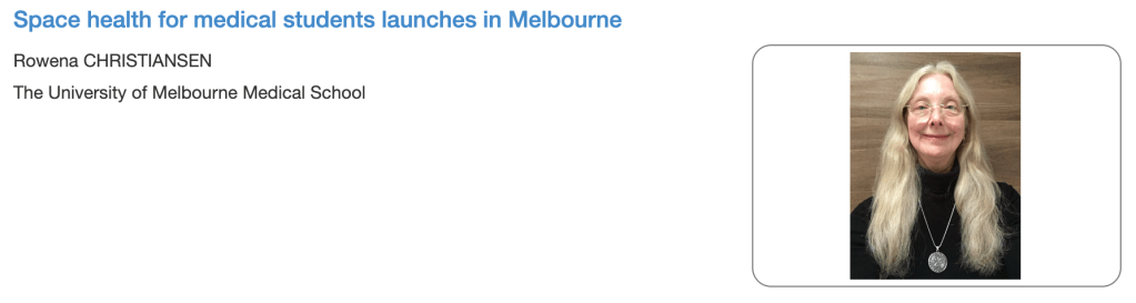 October 2022 – The AsMA Education and Training committee proposed a panel for the 2023 AsMA Annual Scientific Meeting in New Orleans on ‘Space Medicine Education’. Rowena was invited to join the panel to talk about the new University of Melbourne course “Human Health in the Space Environment”, and an abstract was submitted. The other abstracts relate to US initiatives, including UTMB, BCM, and the University of Colorado. The panel and abstracts were accepted.