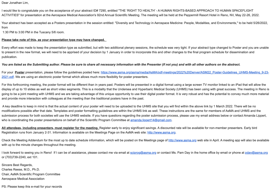 Abstract accepted for an allocated speaking opportunity on “Space Health for Medical Students Launches in Melbourne”.