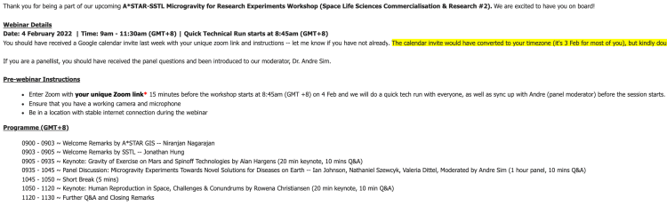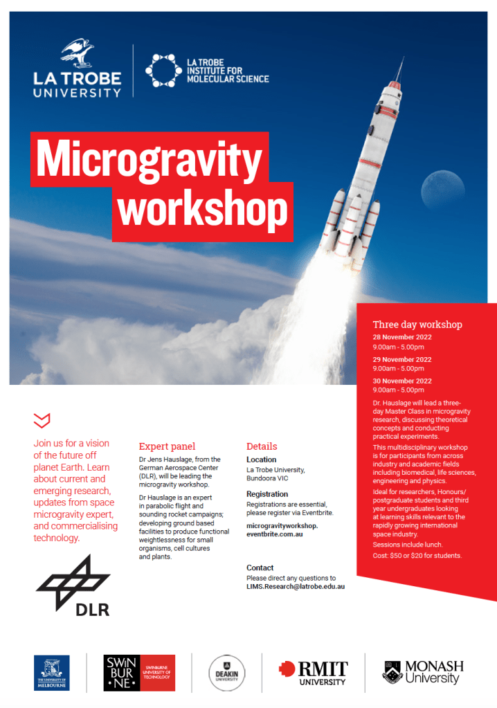 Attended a three-day Microgravity Workshop (28-30 November 2022) organised by Professor Patrick Humbert from LIMS at La Trobe University and presented by Dr Jens Hauslage from DLR (the German Aerospace Agency).