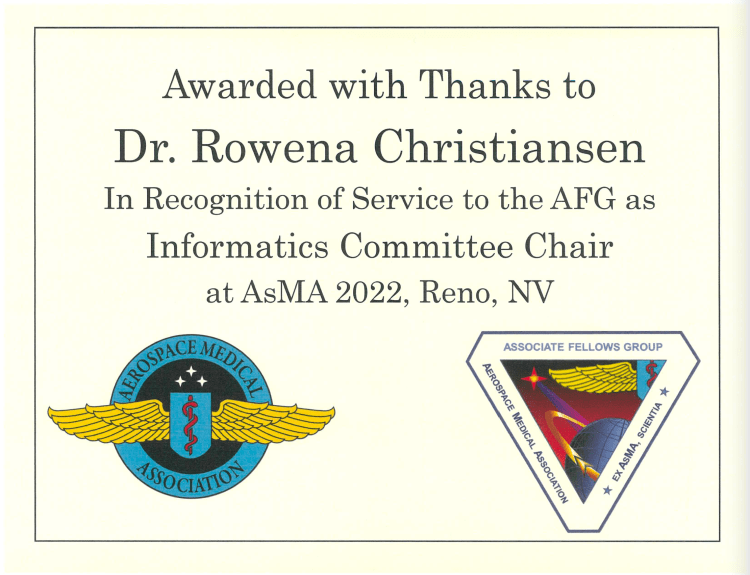 Recent appointments to the Aerospace Medical Association (AsMA) Ad Hoc Committee on Commercial Spaceflight and the AsMA Education and Training Committee.
