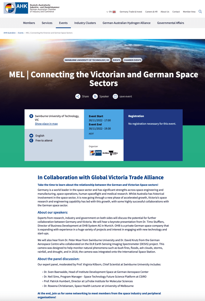 The German-Australian Chamber of Commerce in collaboration with Global Victoria Trade Alliance and Swinburne University of Technology is hosting an evening event on “Connecting the Victorian and German Space Sectors” on 30 November 2022. Proud to be a panellist.