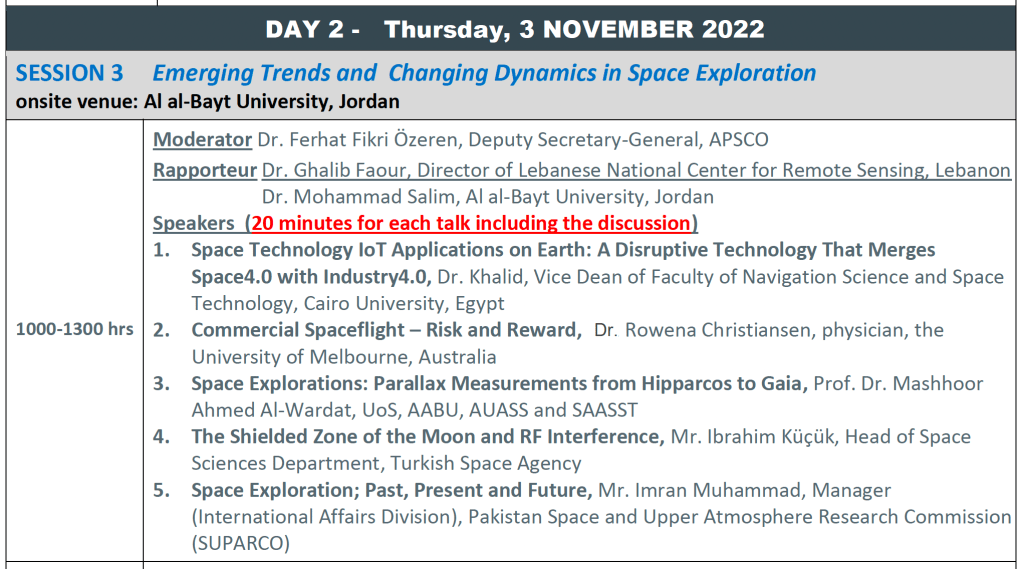 Invited to travel and speak at the Asia-Pacific Space Cooperation Organization (APSCO) and Arab Union for Astronomy & Space Sciences (AUASS) INTERNATIONAL SYMPOSIUM 2022 on Space Exploration-Moon and Beyond, 2-4 November 2022 in Amman, Jordan, on the subject of ‘humans in space’. Abstracts provided as requested on “Learning how to live on the Moon and Mars” and “Commercial Spaceflight – risks and rewards“. The latter was selected, and a pre-recorded presentation was provided.