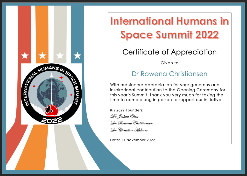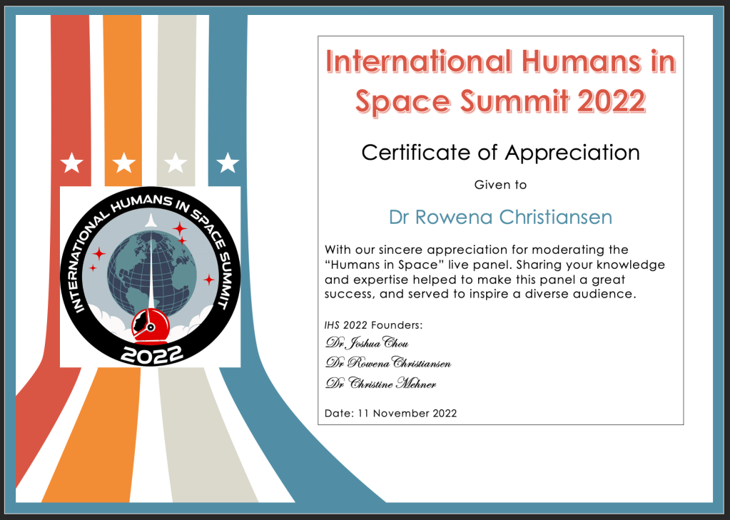 Moderator for the ‘Humans in Space’ panel at the International Humans in Space Summit, Sydney, 08 November 2022.