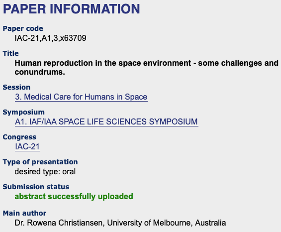 Presentation on “Human reproduction in space – challenges and conundrums”