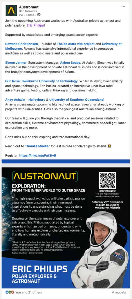 Dr Rowena Christiansen is dual-qualified in medicine and law, with post-graduate studies in emergency health, aerospace medicine, space studies, disaster management, anaesthetics, and child health. She also holds qualifications in business, humanities and education. Rowena primarily practises in medicine in extreme and austere environments and pre-hospital emergency care. She is a Fellow of the Aerospace Medical Association (AsMA), the Aerospace Human Factors Association, and of Ormond College at the University of Melbourne. Rowena is the author and coordinator of a new subject on “Human health in the space environment” for the Melbourne Medical School, and lectures on ‘humans in space‘ for Swinburne University of Technology. She is a passionate aerospace medicine advocate, educator, researcher, and editor/reviewer, embracing the importance of international collaboration and networking. Rowena volunteers in support of diverse professional organisations, and is the first Australian Vice-President of the Aerospace Medical Association (AsMA) and the Organisation for Space Medicine, Engineering, and Design. She is a founding member of the Space Surgery Association, and the current Parliamentarian. In late 2019, she founded the “ad astra vita” project, focusing on space health and medicine in austere and extreme environments, and is a co-founder of the International Humans in Space Summit and the Melbourne International Space Festival. Rowena is a six-year finalist in the Australian Space Awards, receiving the 2023 “Innovator of the Year” award, and has also received several aerospace medicine awards.